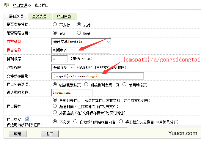 后台-核心-网站栏目管理,编辑顶级栏目"新闻中心",把它的文件保存目录填写为"公司动态"的文件保存目录