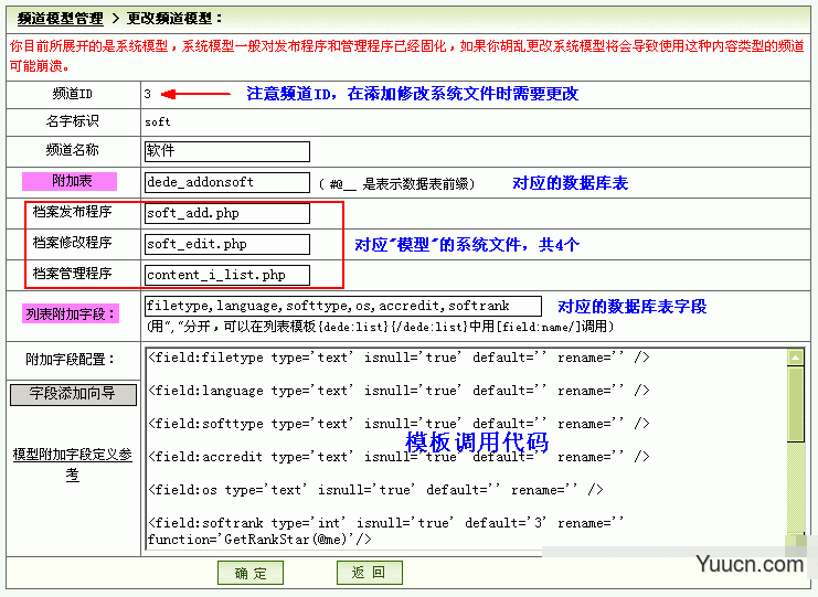 界面里就简单的几行填写表单,里面“附加表”、“列表附加字段:”分别是CMS系统自动创建的“数据库表”、表里的“字段”(注意:dedeCMS有一个共用的表“archives”,各个模型都共用其中的好些字段,所以“软件模型”里的字段并不多):