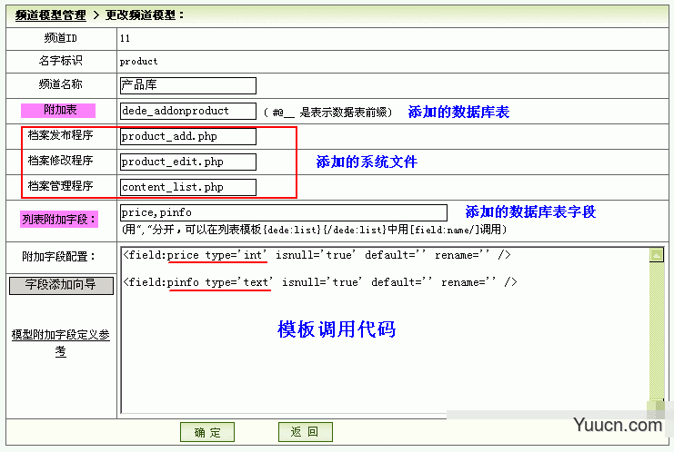 接着在管理后台原标签点击[增加新模型],打开新建“模型”界面,把“软件模型”地内容对应地复制过来,然后根据前面设计的表名、字段进行修改,按下图修改好之后点击“确定”,“产品库模型”建立了。